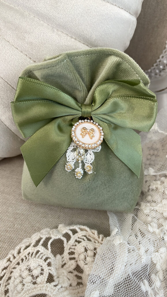 Eukalyptusduft Säckli mit Schleife & Diamanten – Duftbeutel Vintage grün (13×10 cm)